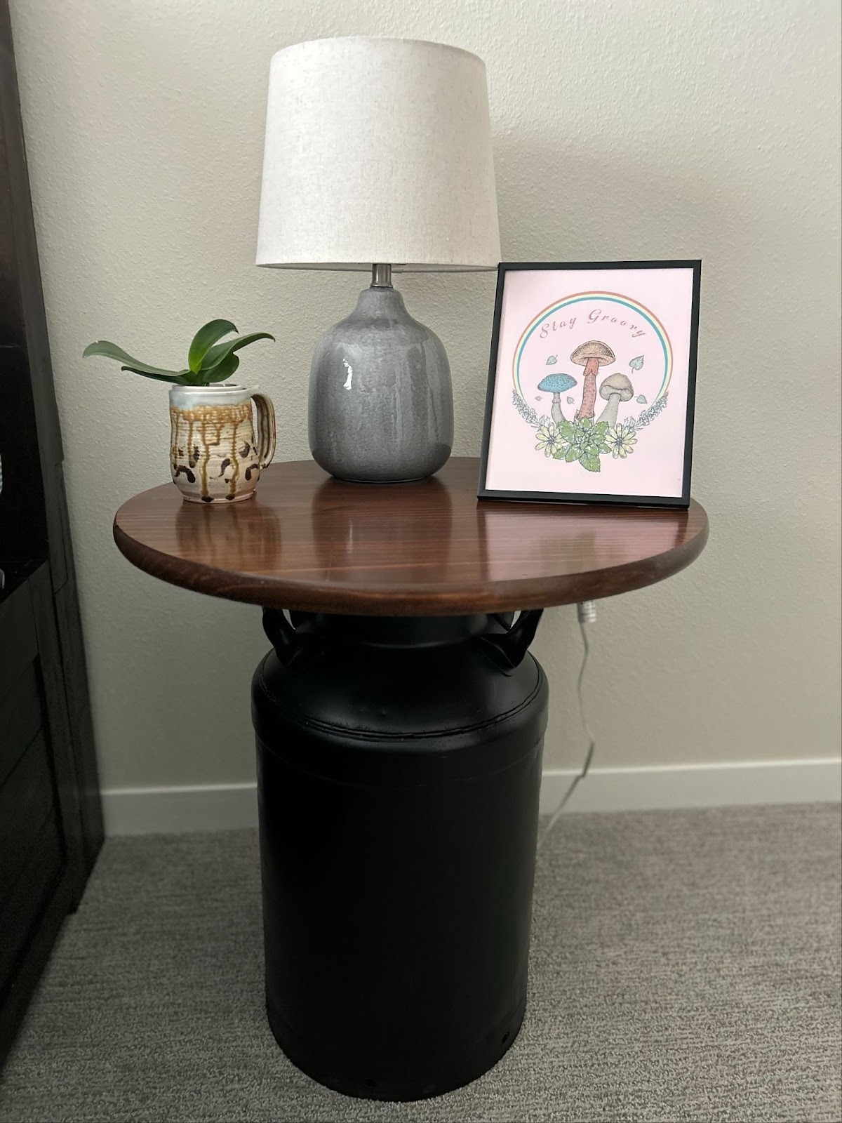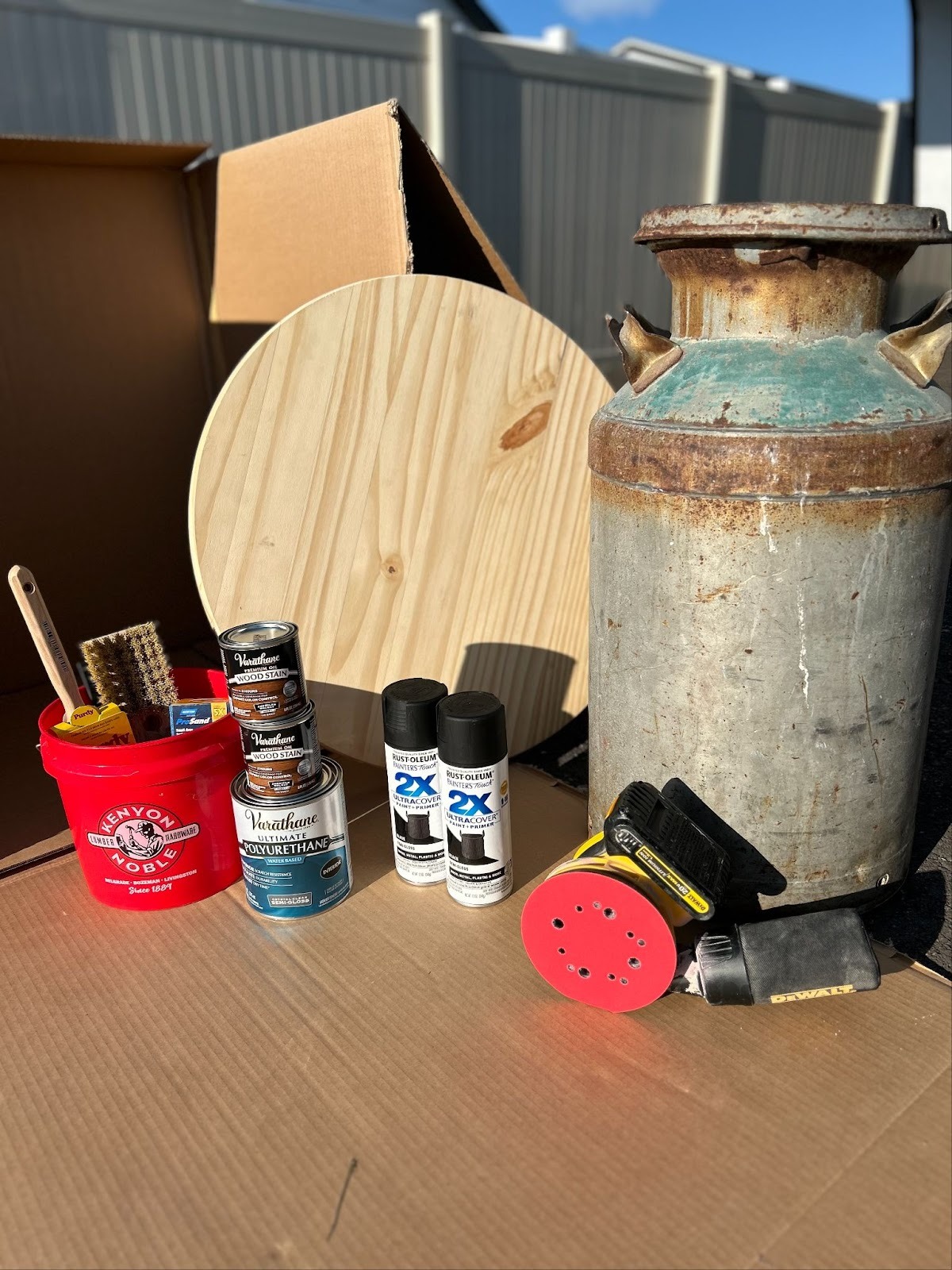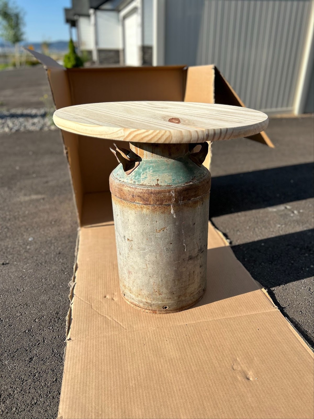 Tracie found an old milk jug in a family barn and wanted to incorporate it into her home but also in her style! She started looking on Pinterest for some ideas and found a milk jug side table and wanted to bring that to life!
